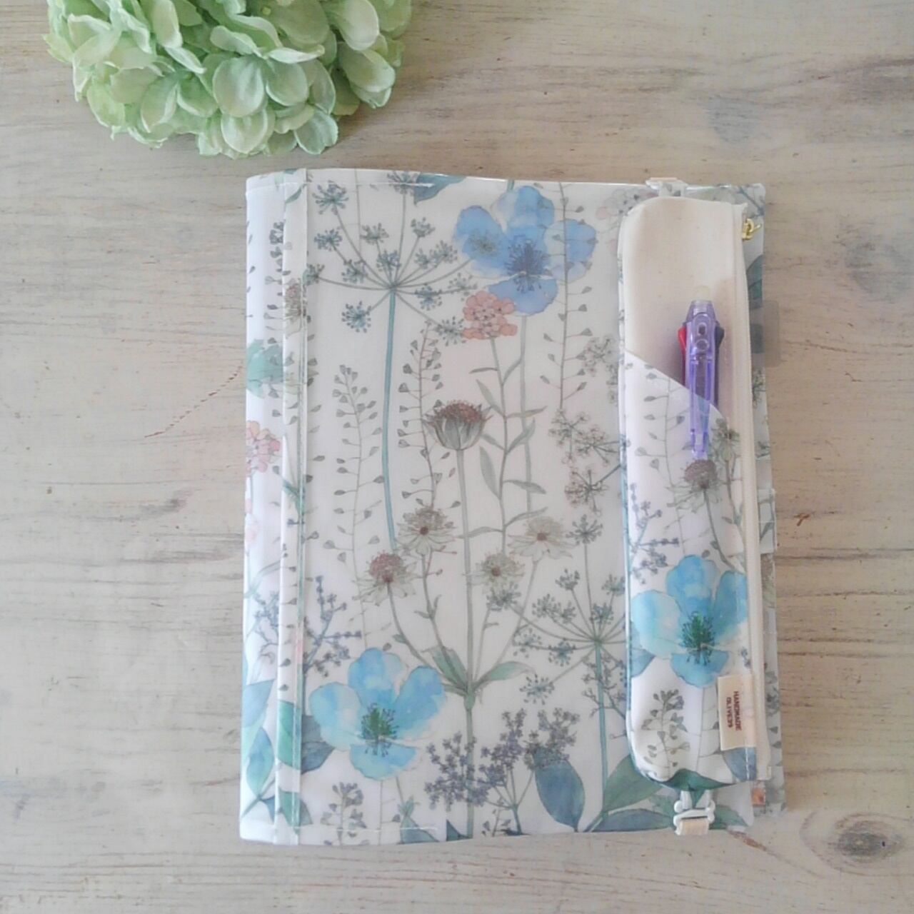 リバティのラミネート生地にて手帳カバーを制作しています。