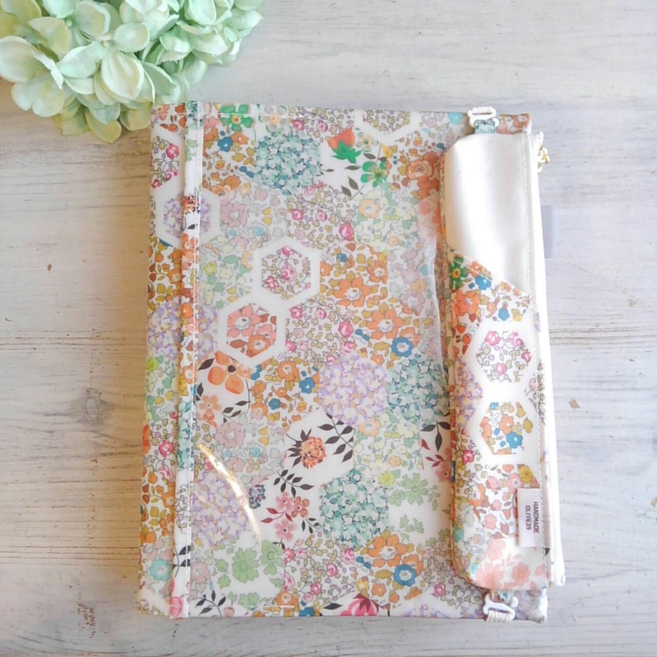 【受注制作】リバティ手帳カバー・ぺンケースセット*パッチワークストーリーズ・グリーン&オレンジ